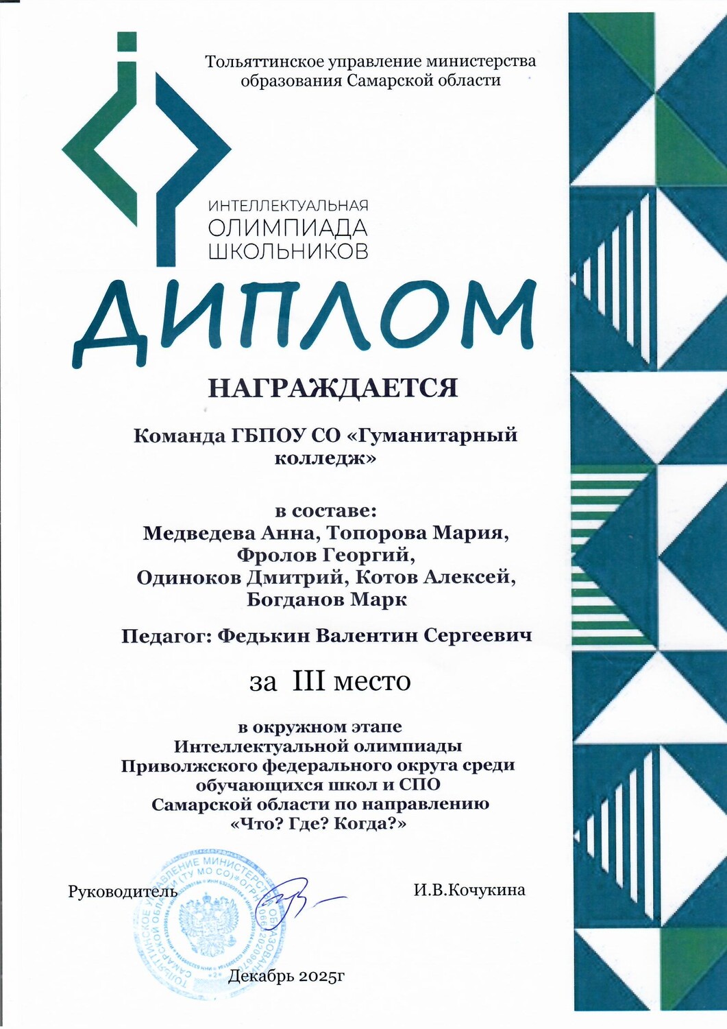 Команда Гуманитарного колледжа заняла 3 место в окружном этапе Интеллектуальной олимпиады ПФО среди обучающихся школ и СПО Самарской области "Что?Где?Когда?"