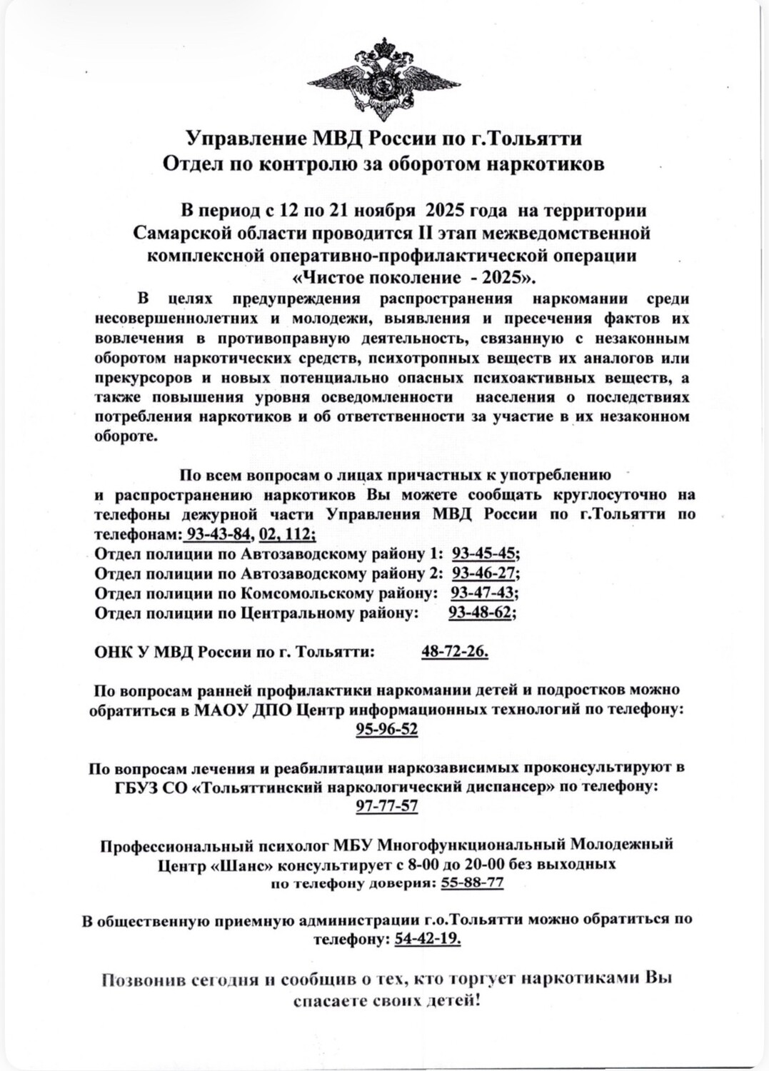 В период с 12 по 21 ноября 2025 года на территории Самарской области проводится II этап межведомственной комплексной оперативно-профилактической операции «Чистое поколение - 2025».