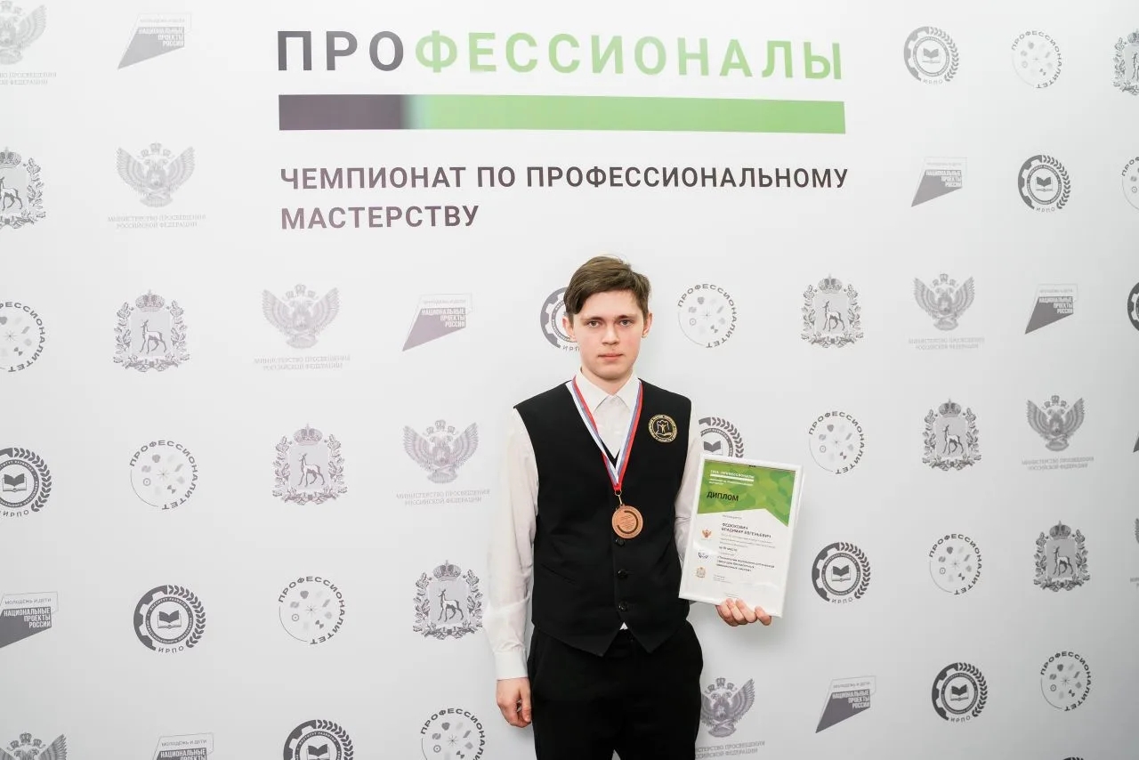 3 место - Федюкович Владимир, компетенция "Технологии волоконно - оптической связи для беспилотных авиационных систем" (наставник Святов Д.Д.)