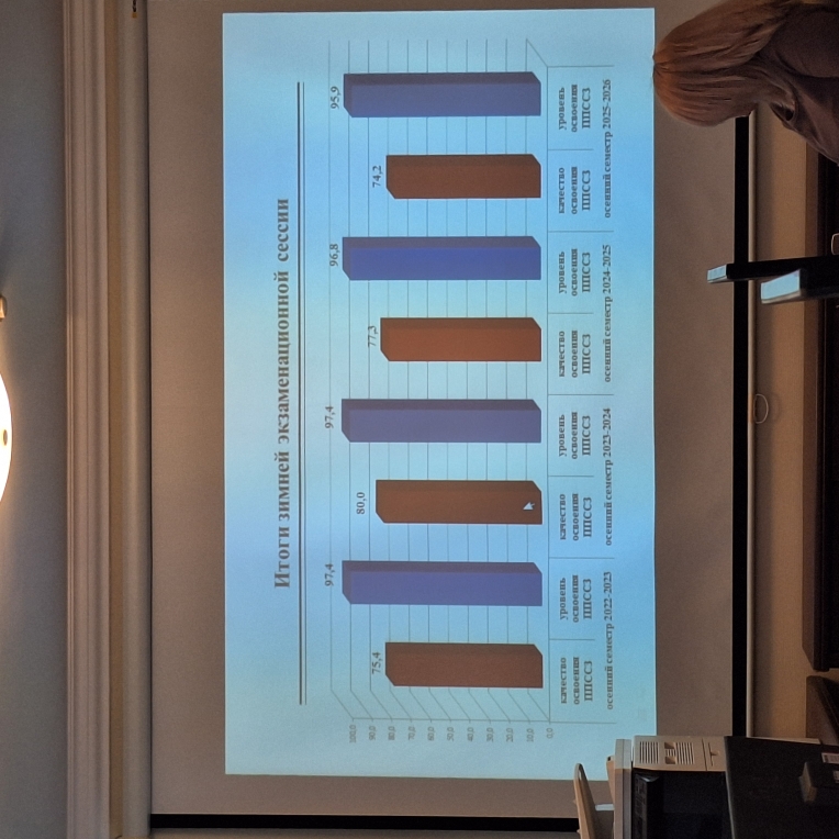 Заместитель директора по учебной работе Джусоева О.В. представила итоги учебной работы осеннего семестра 2025-2026 г., анализ участия студентов в отборочных соревнованиях регионального чемпионата «Профессионалы», анализ качества демонстрационных экзаменов и предстоящие планы на весенний семестр.