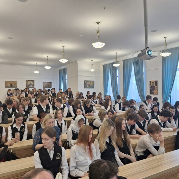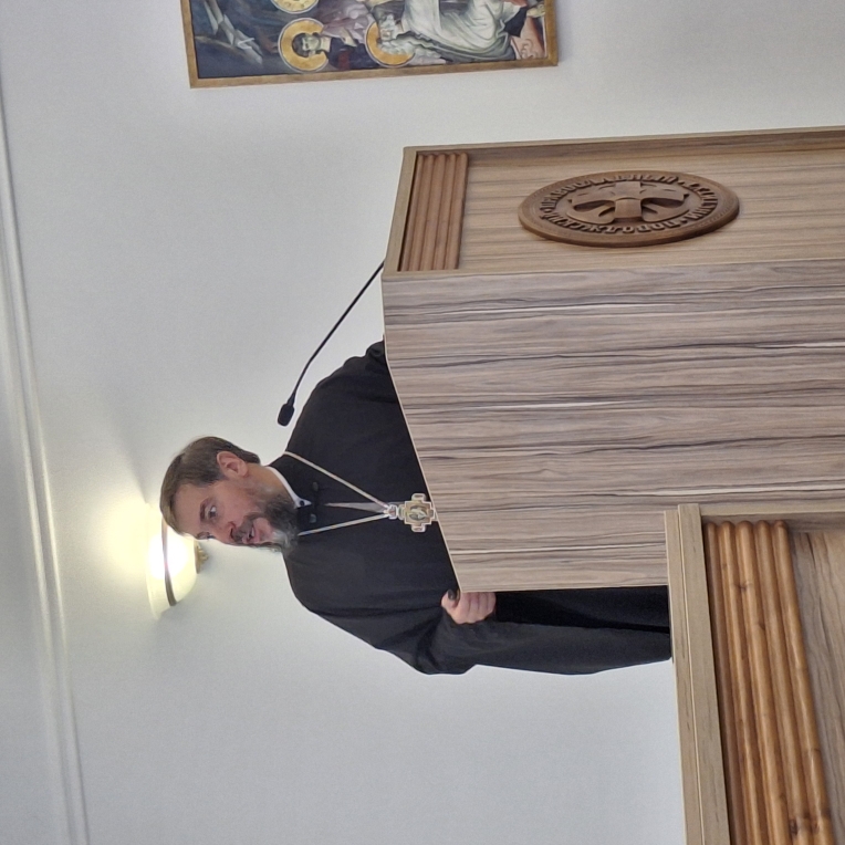 В поточной аудитории Академии состоялась встреча первокурсников с о. Димитрием Лескиным, где он рассказал об особенностях системы непрерывного образования и познакомил с Кодексом чести студентов Гуманитарного колледжа.